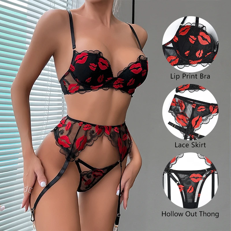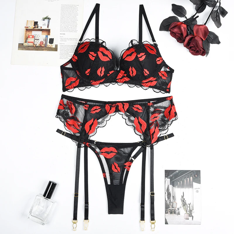 JENGS Woman Bra Panty 3 Piece Set Sexy Floral Embroidered Lingerie for Young Women Firm Control Level with Lace Decoration